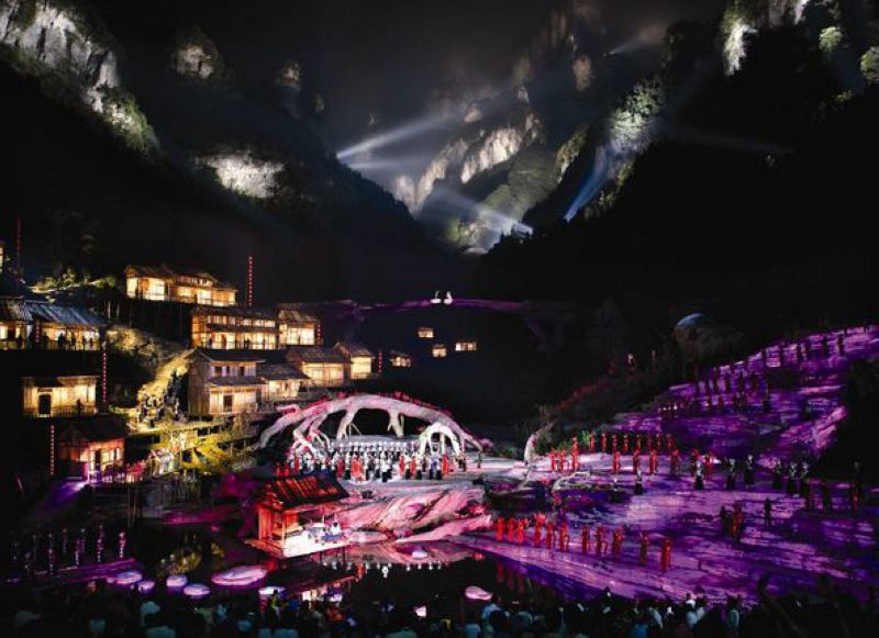A Fox Fairy of Tianmen Mountain – the New Story of Woodman Liuhai is unveiled against the background of a valley measuring about 5km in length stretching from the mountain gate of Tianmen Mountain scenic spot to the top of Tianmen Mountain, with altitude difference of 1100m.The auditorium and main stage occupy a total area of 19880 ㎡. The panoramic stage made of glass steel occupies an area of 10000㎡, which is transparently bright with lighting effect to form a fantastic scene. The performance areas are divided into five parts: central stage, mankind's world on the left, fox's world on the right, the singing platform in the front and the live-action of terrace and Timber Bridge at the back.