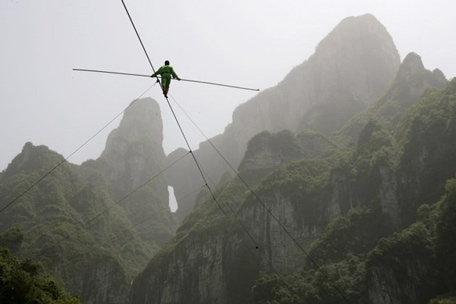Samat Hasan, a 24-year-old stuntman from Xinjiang Uighur Autonomous Region, walks on a tightrope in Tianmen mountain of Zhangjiajie, Hunan province. Walking on a 700-metre-long (2,300 ft) rope with a 3.1-centimetre (1.2 inches) diameter and set at a 39-degree gradient, Hasan successfully broke the Guinness World Record for aerial tightrope walking after failing in a previous attempt in October last year, local media reported. (REUTERS)