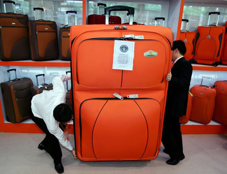 Staff members try to move a huge trolley case during the 100th Chinese Export Commodities Fair in Guangzhou, south China's Guangdong province. This trolley case has been certified as the world's largest by the Guinness World Records and measures 175cm (5ft 9in) by 115cm (3ft 9.3in) by 46cm (1ft 6.1in) thick. (REUTERS)
