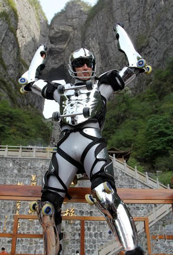 Yves Blondeau, wearing specially designed body skate to challenge the venue with 99 turns in Mount Tianmen which is noted as the “ the World’s First Road Wonder”.